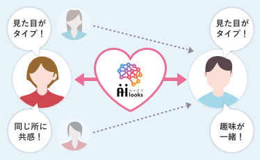 こっちは先ほどのAI looks、プロフィール写真や条件だけに偏らないように、過去にしたお見合いデータや会員さんの活動履歴などをディープラーニング(人間の力なしに機械が自動的にデータから特徴を抽出)して、愛称が良さそうなお相手をこちらからもピックアップし紹介してくれます。