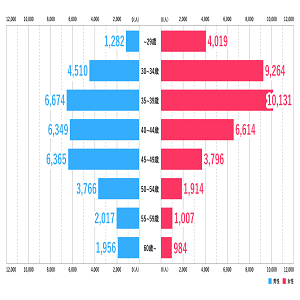 女性のボリュームゾーンは30歳~39歳なので、20歳代の5倍の人数が登録されております。