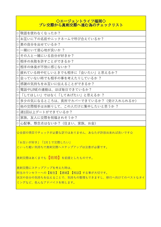 真剣交際に進む為に、プレ交際中にすべき事のチェックリストを添付しておきますので、ぜひ活用してくださいね(*^-^*)