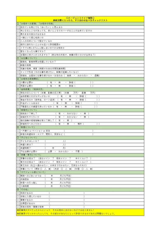 相談所によっては、真剣交際に入っても成婚退会までは60%位の確率なんて言われる所もありますが、プレ交際で抑えるべき所をしっかり確認しておけば大丈夫でございますので、弊社のプレ交際から真剣交際へ進む為のチェックリストを活用下さい(*^-^*)
