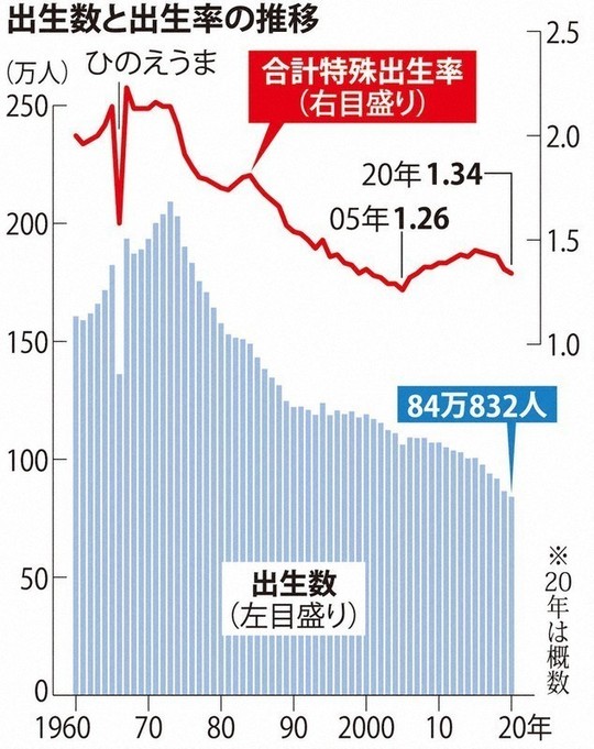 2020年度は、生まれて来た数84万人、死亡した人数137万人