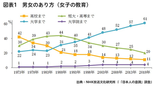 男子は大学生までだったが、女子は1973年時点一番多かったのは高校まで、その次は短大&高専、大学生までは22%の結果だった。