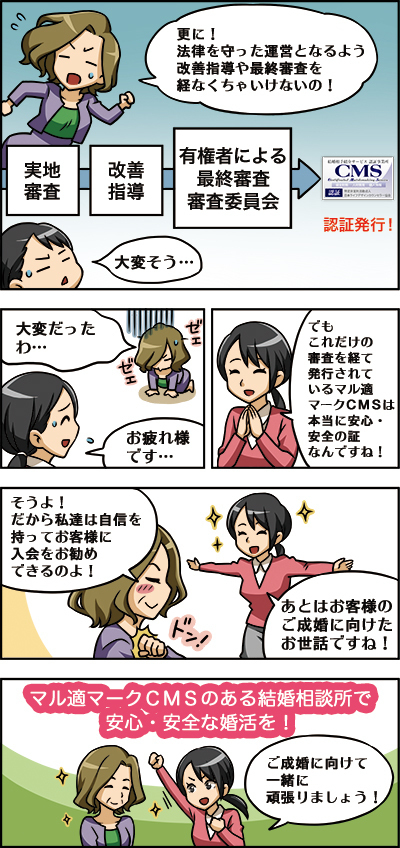 「マル適マーク」は結婚相手紹介サービス業(※以下「結婚相談業」)を所管する経済産業省が作成した、「結婚相手紹介サービス業に関するガイドライン」を基に、第3者機関が結婚相談所を審査し、審査基準を満たしたところに認証発行されています。