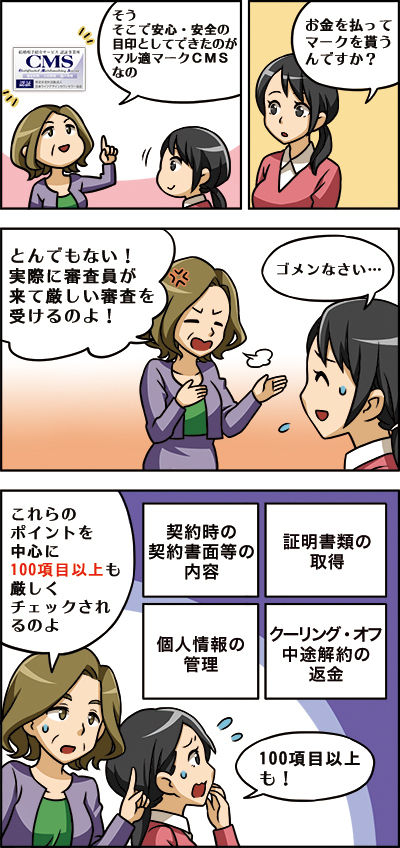 特定商取引法や個人情報保護法等、関係法令が遵守されているかを、厳しくチェックされています。