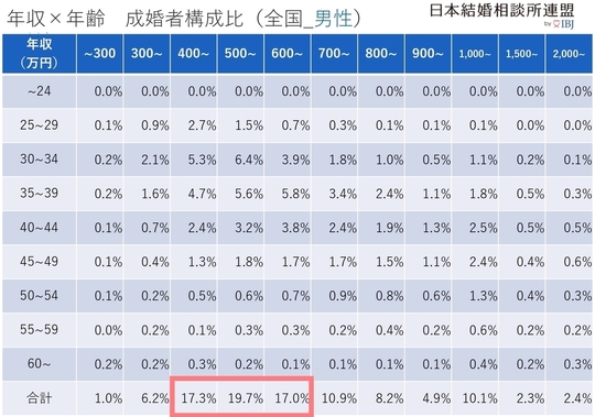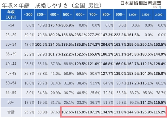 成婚しやすくなるのは、年収500万円から。年齢があがるにつれて年収の影響が大きくなっていくのが分かる。