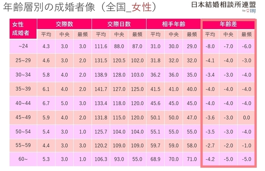 お相手との年齢差は、男性と真逆で世代が上がるにつれ年齢差が明確に縮まっているのが読み取れる。