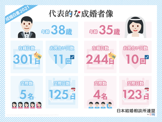 代表的な成婚者像は、【男性38歳】【女性35歳】結婚相談所での在籍期間は10ヶ月未満。