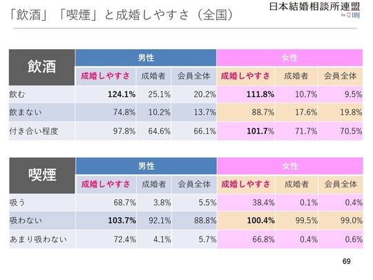 ・飲酒では、男女とも【飲む】を選ばれた方の成婚しやすさが100%を超えている、夫婦で嗜む事を想像出来るからなのかもしれません。